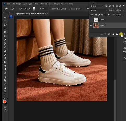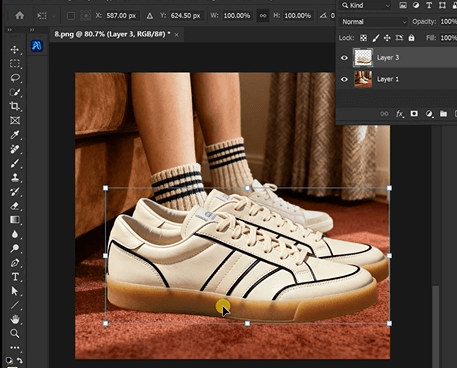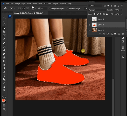 Upload the model’s photo (the one with old shoes) to Photoshop. Grab the Paint Bucket or Brush Tool. Fill the old sneakers with red. Done!