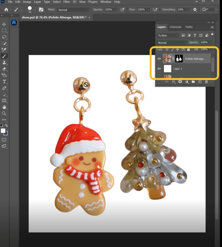 With your enhanced earrings ready, switch to Background Remover within the PsAide panel. This tool surpasses traditional selection methods by understanding product edges and transparent elements. Unlike simple background erasers that struggle with fine details, the AI analyzes the transition between product and background, creating precise masks that preserve delicate features like chain links, gemstone facets, and metallic filigree. For Christmas earrings with sparkly elements or intricate patterns, this intelligent edge detection proves particularly valuable, maintaining the holiday details that make your products special.
