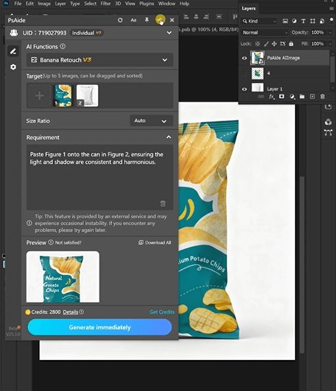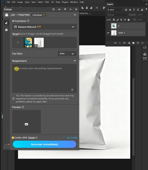 ② Upload & Define Requirements: In the plugin panel, upload the snack bag ) and your graphic . Enter a prompt: