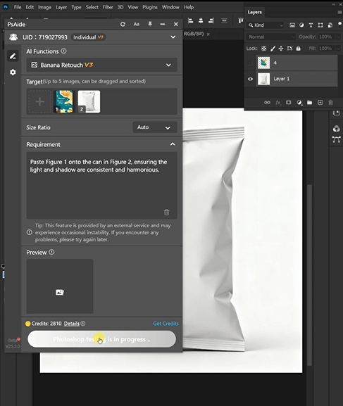 ① Import Assets: Open your snack bag image (e.g., the white plastic pouch) and your graphic file in Photoshop. Launch the Nano Banana plugin via the Plugins menu.