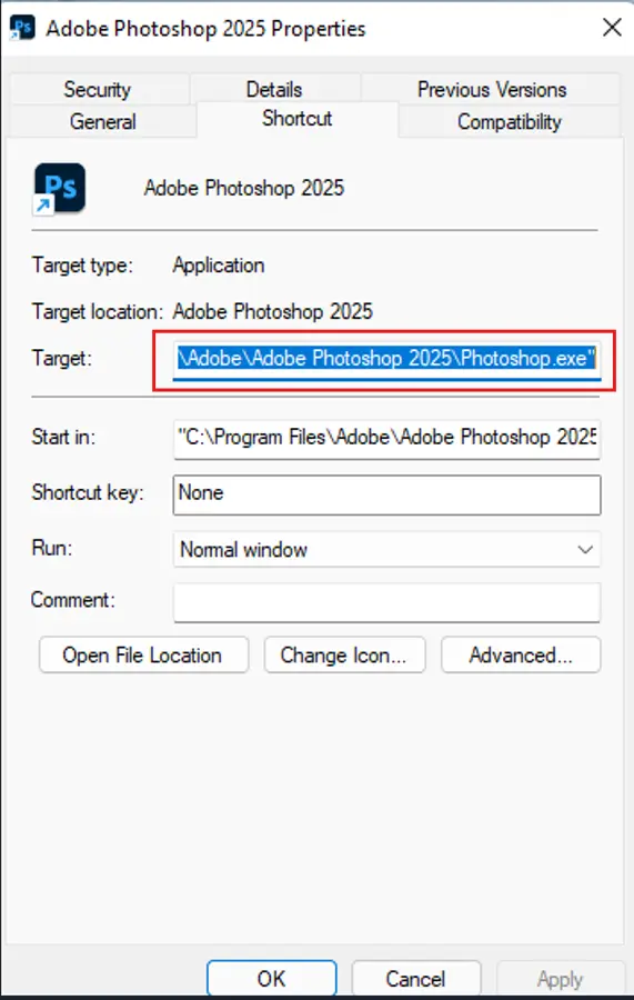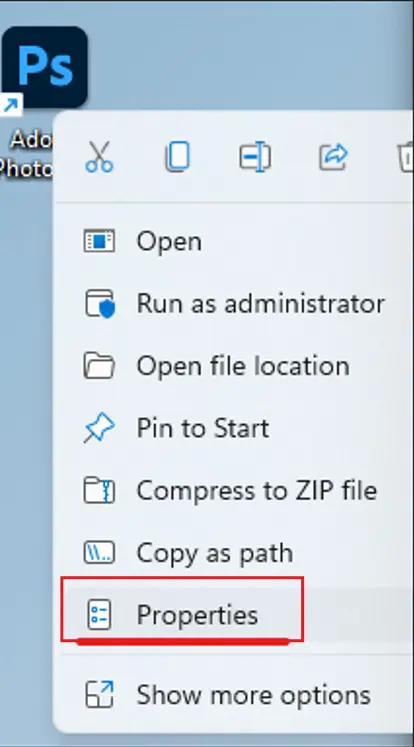 - Right-click the Photoshop icon on the desktop, and select “Properties” from the pop-up menu.