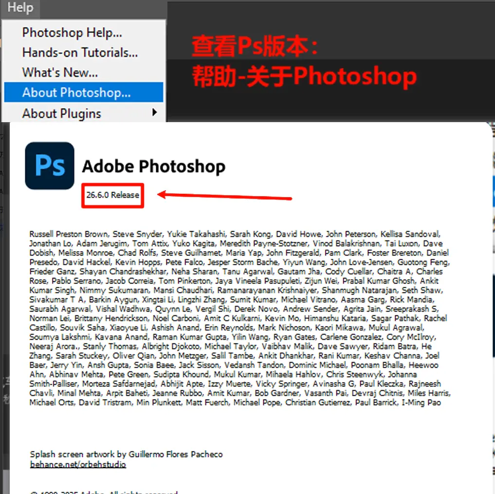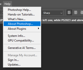 Open Photoshop, click Help from the top menu bar, and select “About Photoshop” to view the current Photoshop version number.