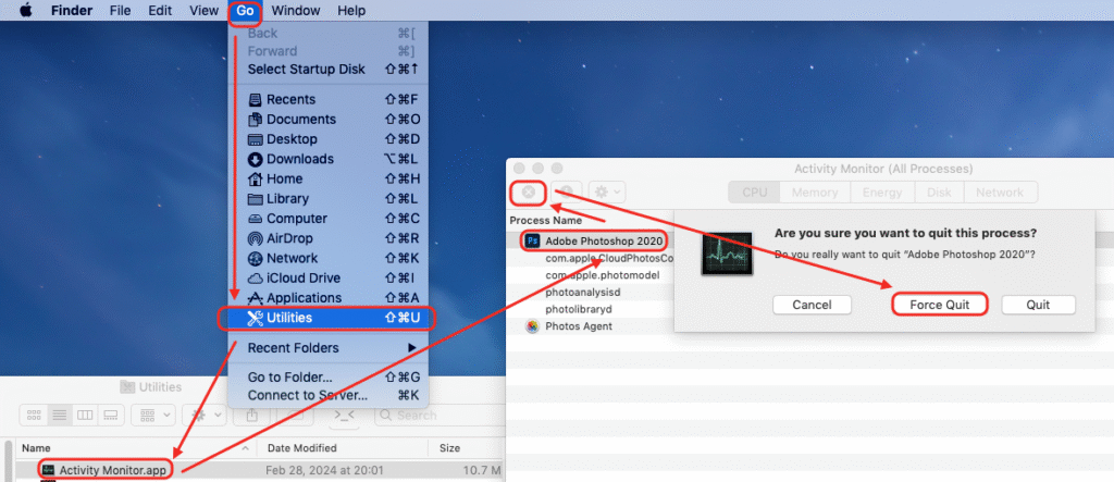 Click “Go — Utilities — Activity Monitor” and find the unclosed Photoshop process in Activity Monitor.
