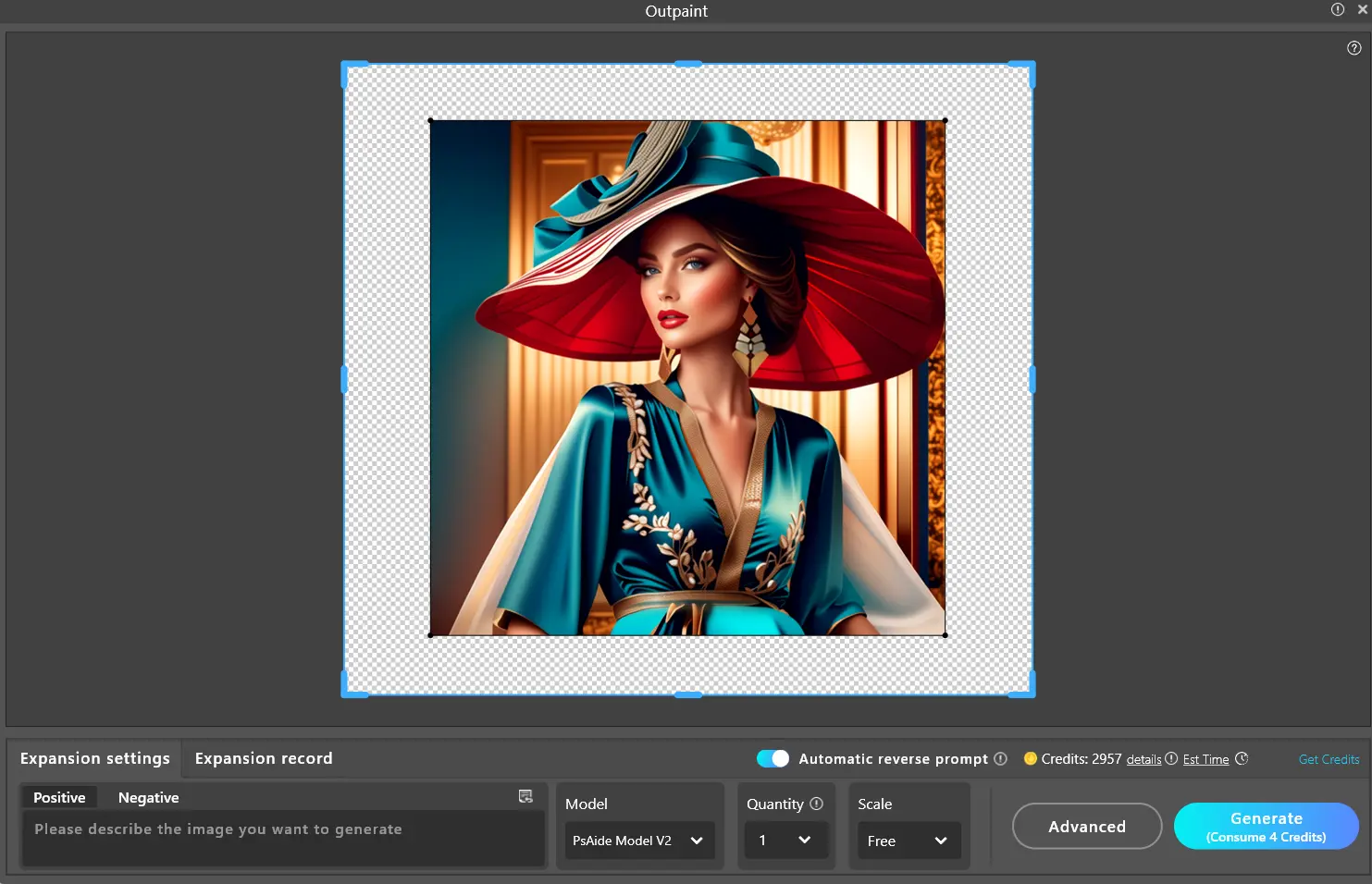 - In the expansion pop-up window, adjust the expansion area by dragging the blue border and scaling the image.