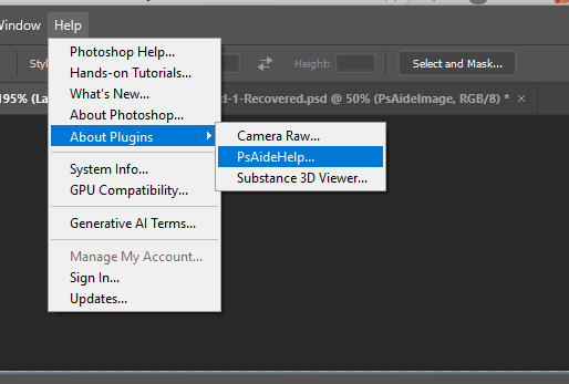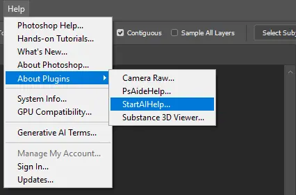 - Check if PSaideHelp is listed under Help – About Plug-ins in Photoshop.