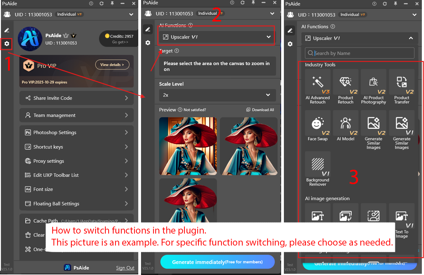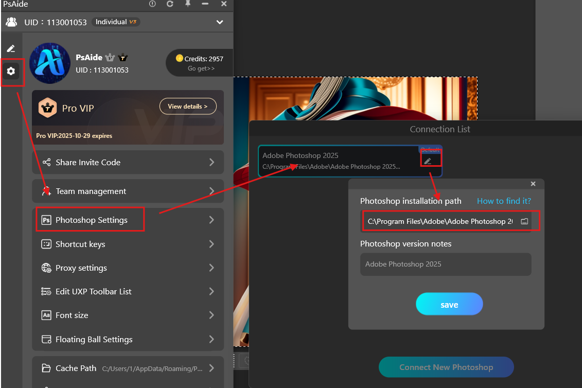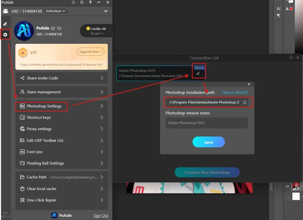 - If multiple versions of Photoshop are running simultaneously, the PsAide Ps Plugin may fail to recognize the current version in use, causing errors. You need to close all other versions and keep only one Photoshop instance running.