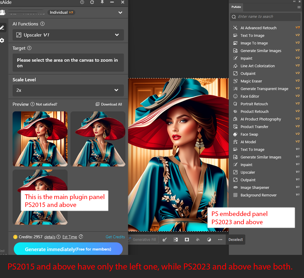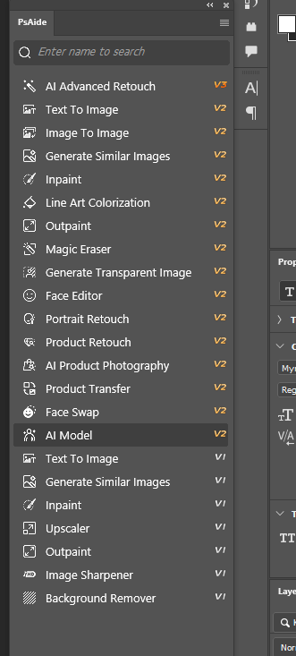 PsAide has two panels. Photoshop 2023 and later support both panels, while Photoshop 2015-2022 do not support the right-side embedded panel.