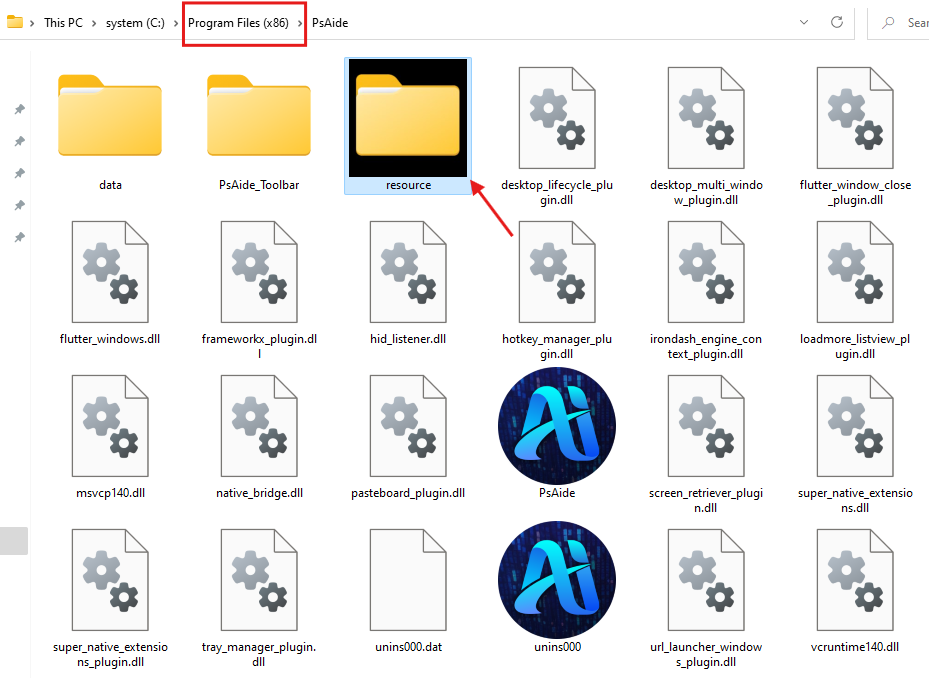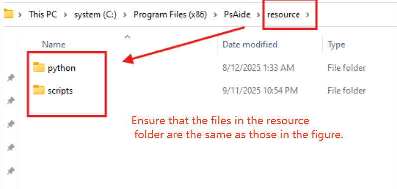 Ensure that the folders under PsAide\resource are named python and scripts.