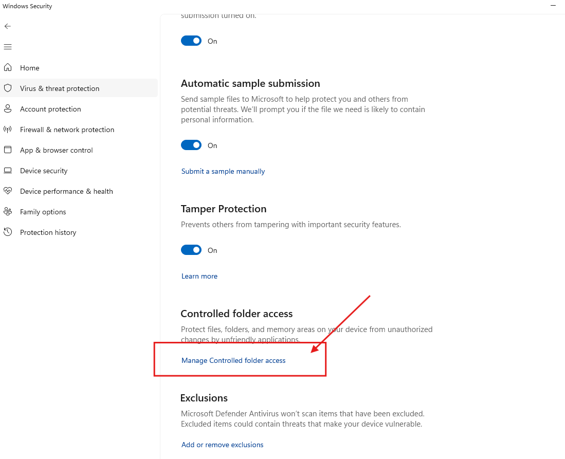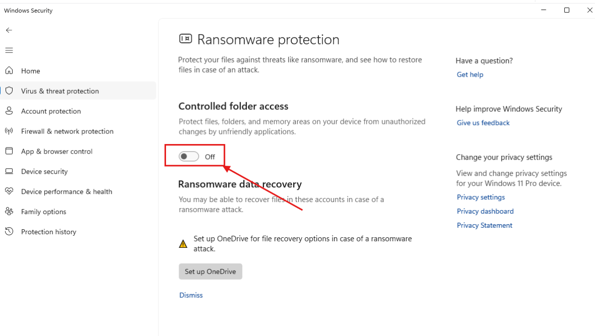 - Scroll down the window to find the “Controlled Folder Access” toggle.