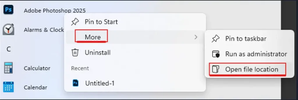 - Go to the Start Menu, right-click Photoshop, select “More” – “Open file location”.