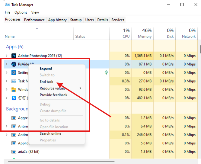 PSaide Go to Task Manager -Processes, find all PSaide processes, right-click and select “End Task”, then restart PSaide